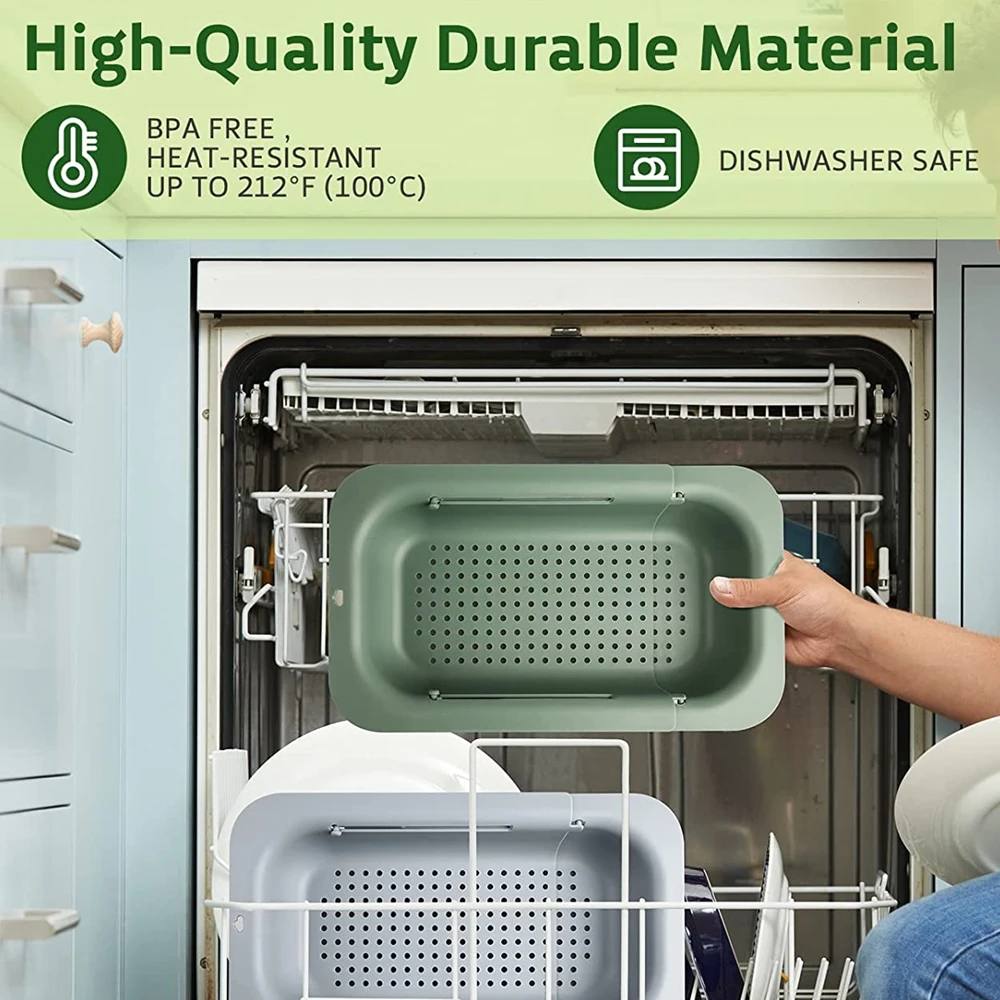 مصفاة قابلة للسحب: يمكن توسيع المصفاة بسهولة من 11.5 بوصة إلى 16.5 بوصة لتناسب الأحواض ذات الأحجام المختلفة وتحمل المزيد من الخضار والفواكه.