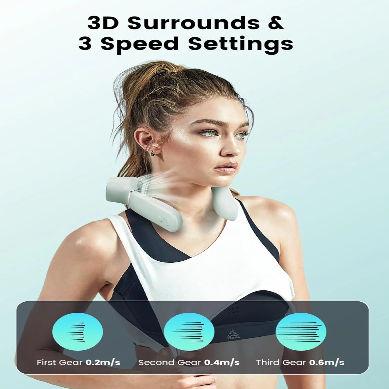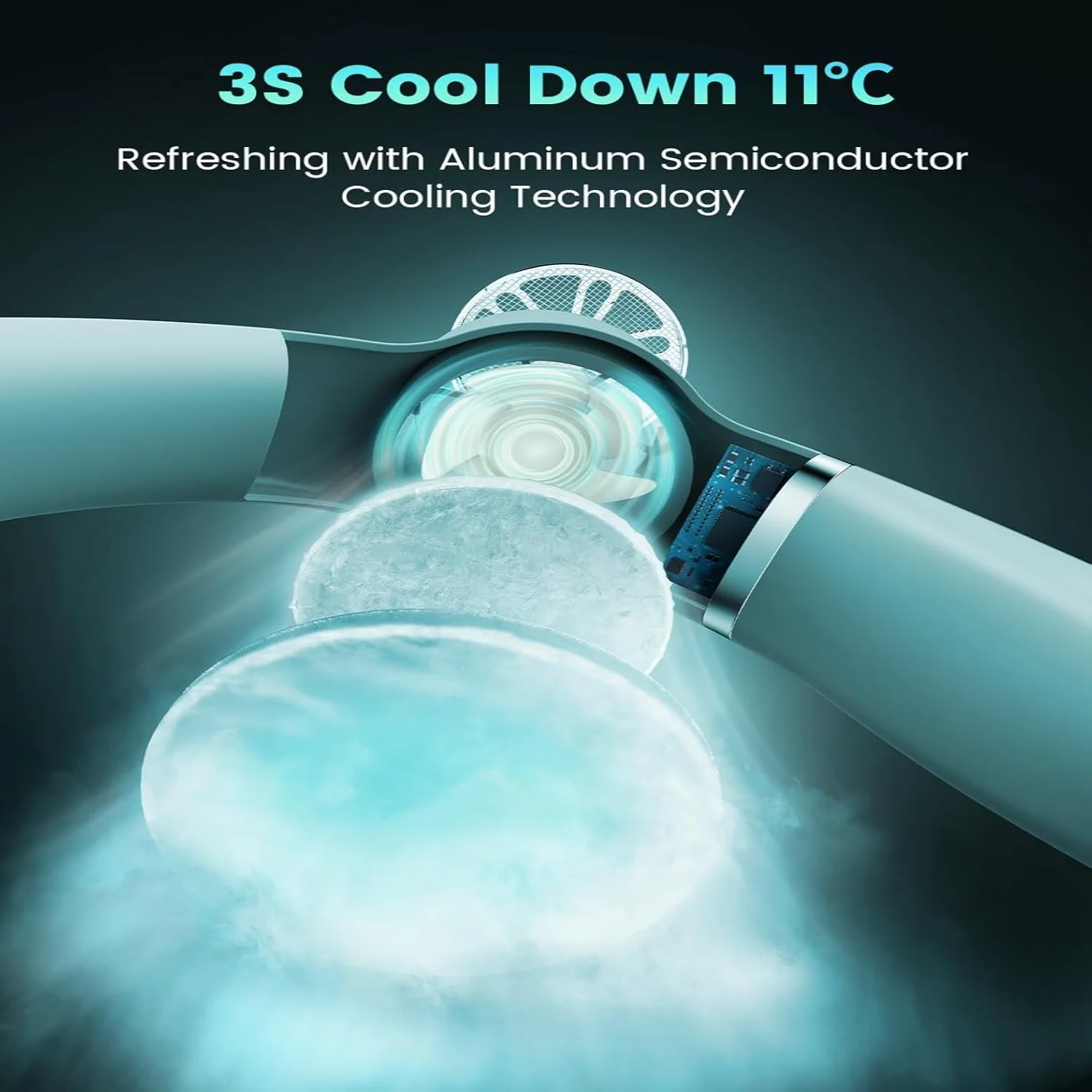 4.استمتع براحة فورية مع حر اليدين° حول مروحة الرقبة للتبريد، تتميز بتقنية تبريد أشباه الموصلات بدون شفرات وتشغيل فائق الهدوء للاستخدام الداخلي والخارجي.