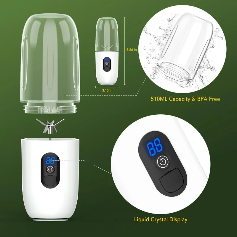--【????????????????????????????????????????????????& ???????????????????????????????????????????؟】: على الرغم من أن الخلاط الصغير المحمول يزن 450 جرامًا فقط، إلا أن سعة كوب العصير تبلغ 510 مل (17.2 أونصة)، وهي أكبر من غيرها في السوق.يأتي هذا الخلاط الصغير المحمول مع غطاء للسفر، سهل الحمل.إنه رائع لخلط الفواكه والخضروات والأغذية التكميلية للأطفال.مثالية لأي مطبخ، مكتب، صالة ألعاب رياضية، تخييم، إلخ أنشطة خارجية.--【????????????????????????????????????????????????????????????& ???????????????????????????????????????؟: مصنوعة من مواد صالحة للطعام، خالية من البيسفينول.يتميز الخلاط المحمول الخاص بنا بوظيفة عرض الكريستال السائل المتقدمة نسبيًا.تمثل الأرقام المختلفة أخطاءً مختلفة تلتقي أثناء العصر، حتى تتمكن من تشخيص أي مشكلات وحلها بوضوح وسرعة.يسمح كوب الشفط الموجود على القاعدة بتثبيت الخلاط على سطح، وهو مريح وآمن للغاية.
