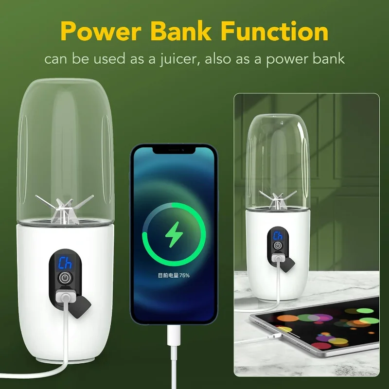 --【???????????????????????????????????????????????????????????????????????????????????????????????????؟】: هذه العصارة قابلة لإعادة الشحن، ويستغرق شحن العصارة بالكامل حوالي 3 ساعات.بطارية بسعة 4800 مللي أمبير تسمح للخلاط الصغير بالمزج حوالي 25 مرة عند الشحن الكامل.مع وظيفة بنك الطاقة، يمكن شحن هاتفك.اضغط لفترة طويلة على زر الطاقة لمدة ثلاث ثوان.بعد ذلك، تعرض الشاشة 05، ويمكن تشغيل وظيفة الشحن في هذا الوقت، مثل شحن هاتفك أو IPaid.
