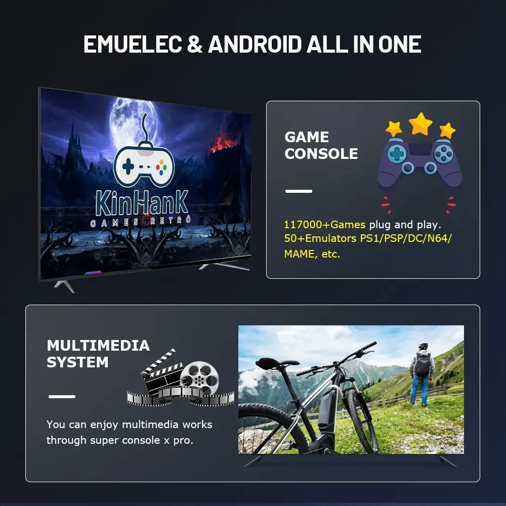 2. نظام مزدوج في واحد: Emuelec ونظام Android في واحد ، يمكنك التحقق من المعلومات وتثبيت ألعاب Android واستخدام وظيفة صندوق التلفزيون وتنزيل تطبيقات مثل Google.
