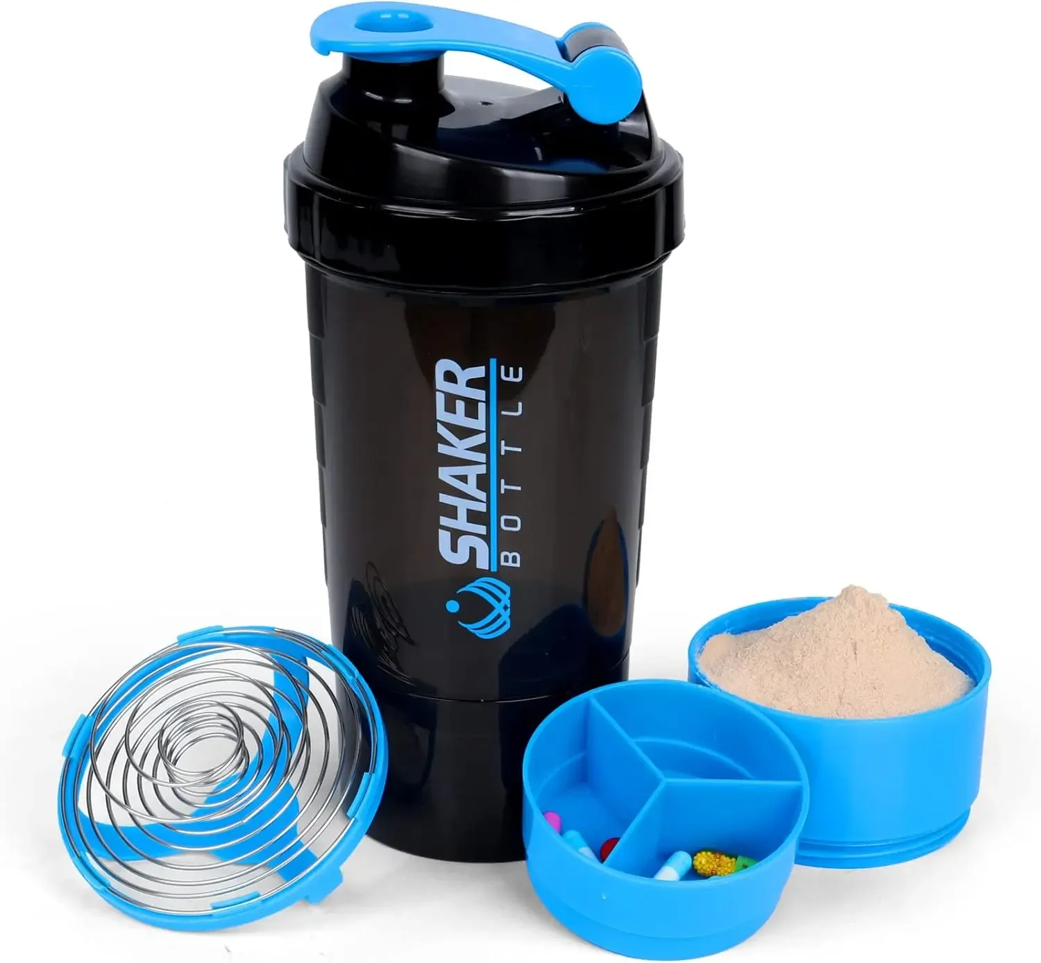 2.بسعة 16 أونصة، مزودة بمقصورات تخزين لمسحوق البروتين والحبوب.