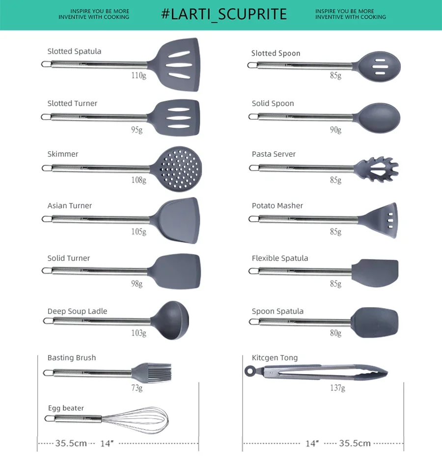 مجموعة الأدوات المتينة هذه آمنة لجميع أسطح الأواني والمقلاة، التصميم ذو الزاوية المثالية يثبت في القوس الأكثر راحة، ويتميز بمقابض مريحة لضمان راحة الطهي.