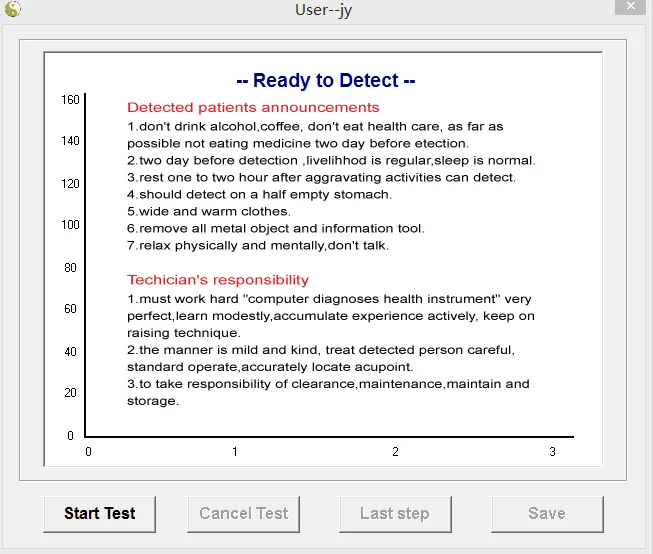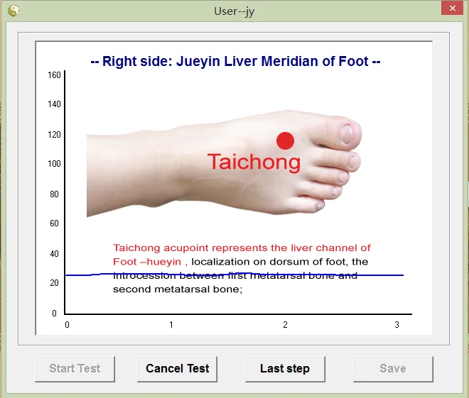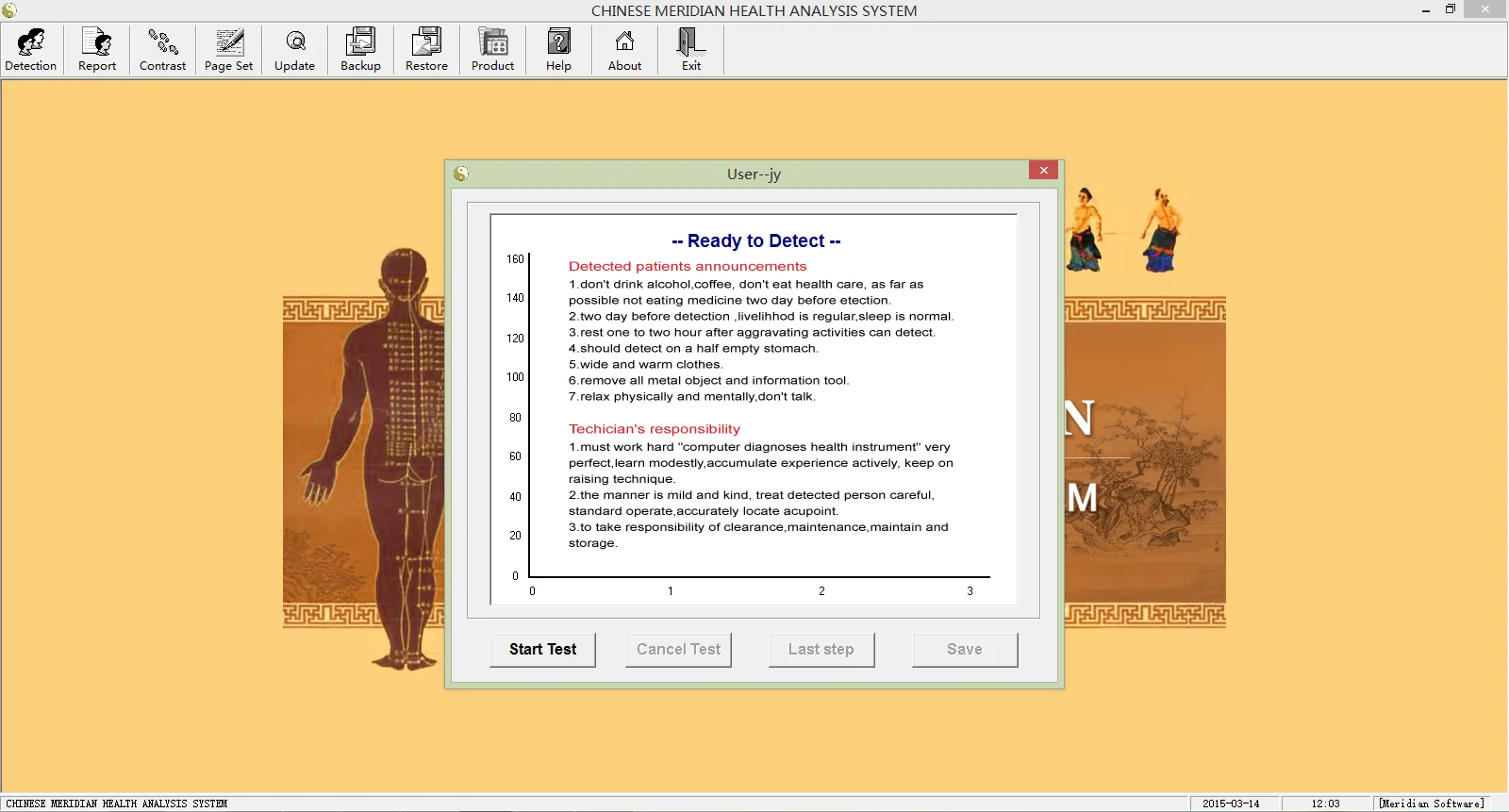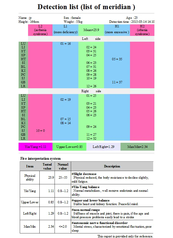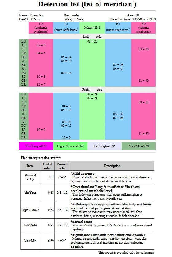 فإنه يمكن تشخيص تغيير الطاقة البدنية والحالة الصحية عن طريق جهاز استشعار قياس قيمة مقاومة جسم الإنسان من 24 نقطة الوخز بالإبر ميريديان وفقا لنظرية ميريديان الطب الصيني جنبا إلى جنب مع التكنولوجيا الطبية الحديثة وتكنولوجيا الكمبيوتر. يمكن للنظام إنشاء ملفات المسار الشخصية لtestee لفهم التغييرات المادية والوقاية. ويمكن أيضا صياغة علاج الرعاية الشاملة ، جمال الجلد المنزل ، والتوجيه الرعاية الصحية لتجديد الطاقة البدنية في الوقت المناسب وبشكل صحيح من أجل حل جميع أنواع المشاكل الداخلية. يمكن توصيل كاشف ميريديان بأجهزة الكمبيوتر لإجراء تحليل اختبار مفصل وطباعة تقرير تحليل الاختبار والتوصيات.