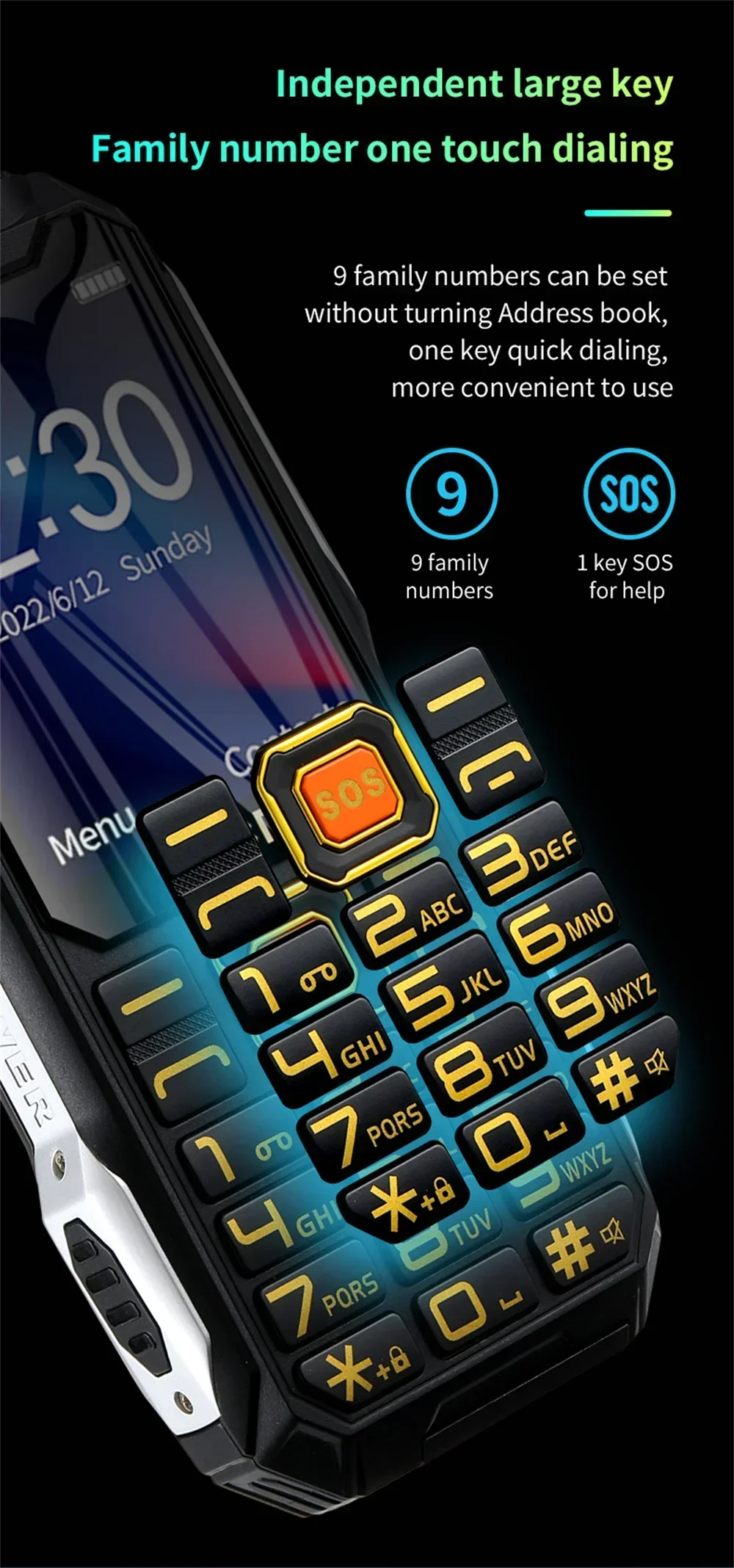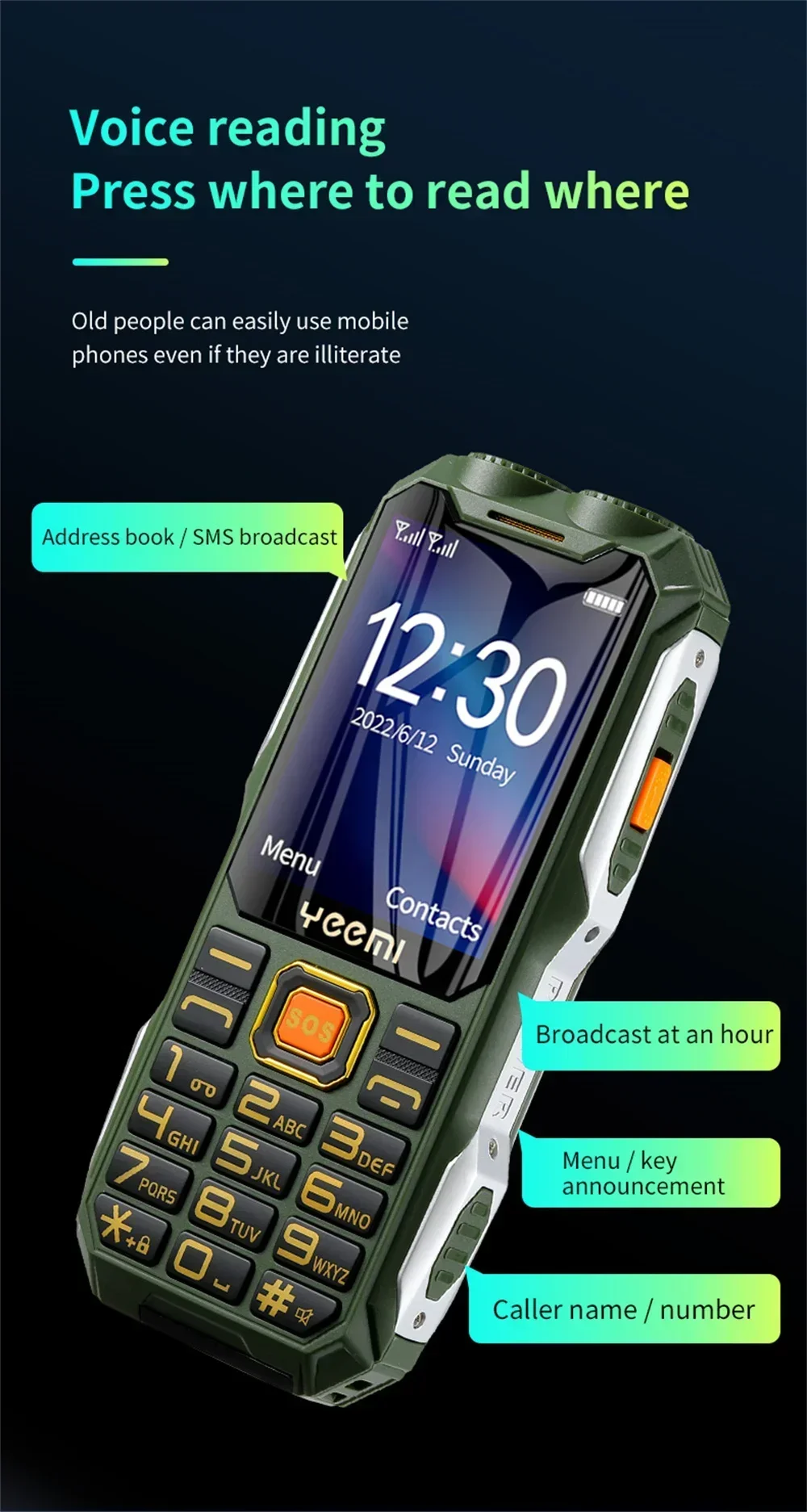YEEMI Q8 GSM 2G هاتف متين بطارية كبيرة مصباح يدوي مزدوج 2.6 بوصة شاشة HD مزدوجة شريحة اتصال الهاتف المحمول زر كبير الهاتف المحمول SOS