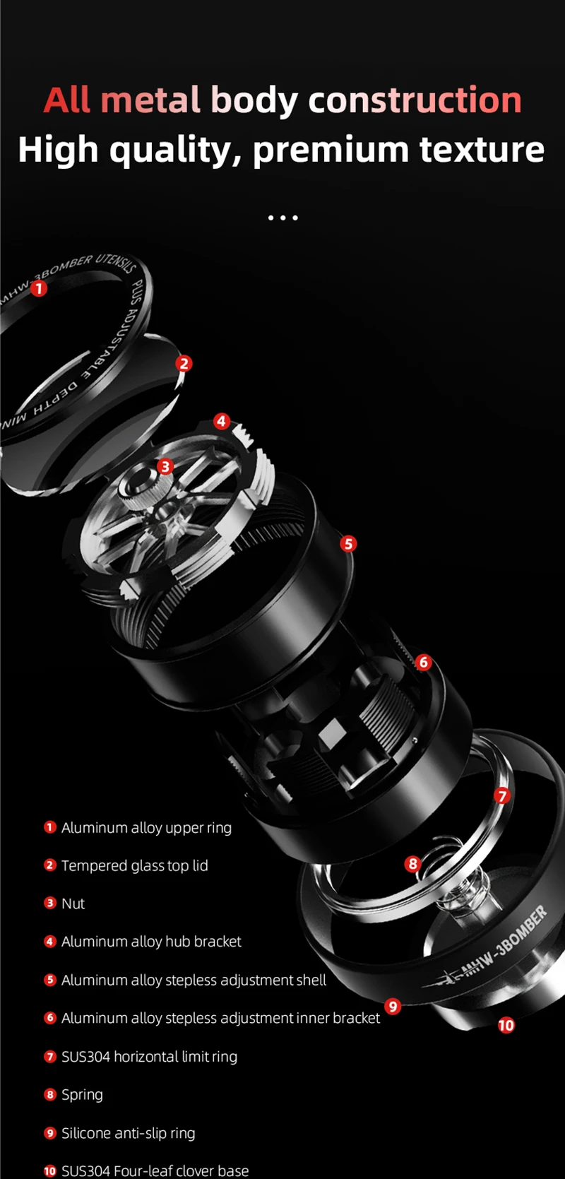 【متانة قصوى】مصنوع من سبائك الألومنيوم المتينة والفولاذ SUS304 المقاوم للتآكل، يضمن موزع قهوة الإسبريسو الخاص بنا طول العمر.حلقة السيليكون المضادة للانزلاق والتخزين المتكامل تحميها من التلف العرضي أثناء الاستخدام.