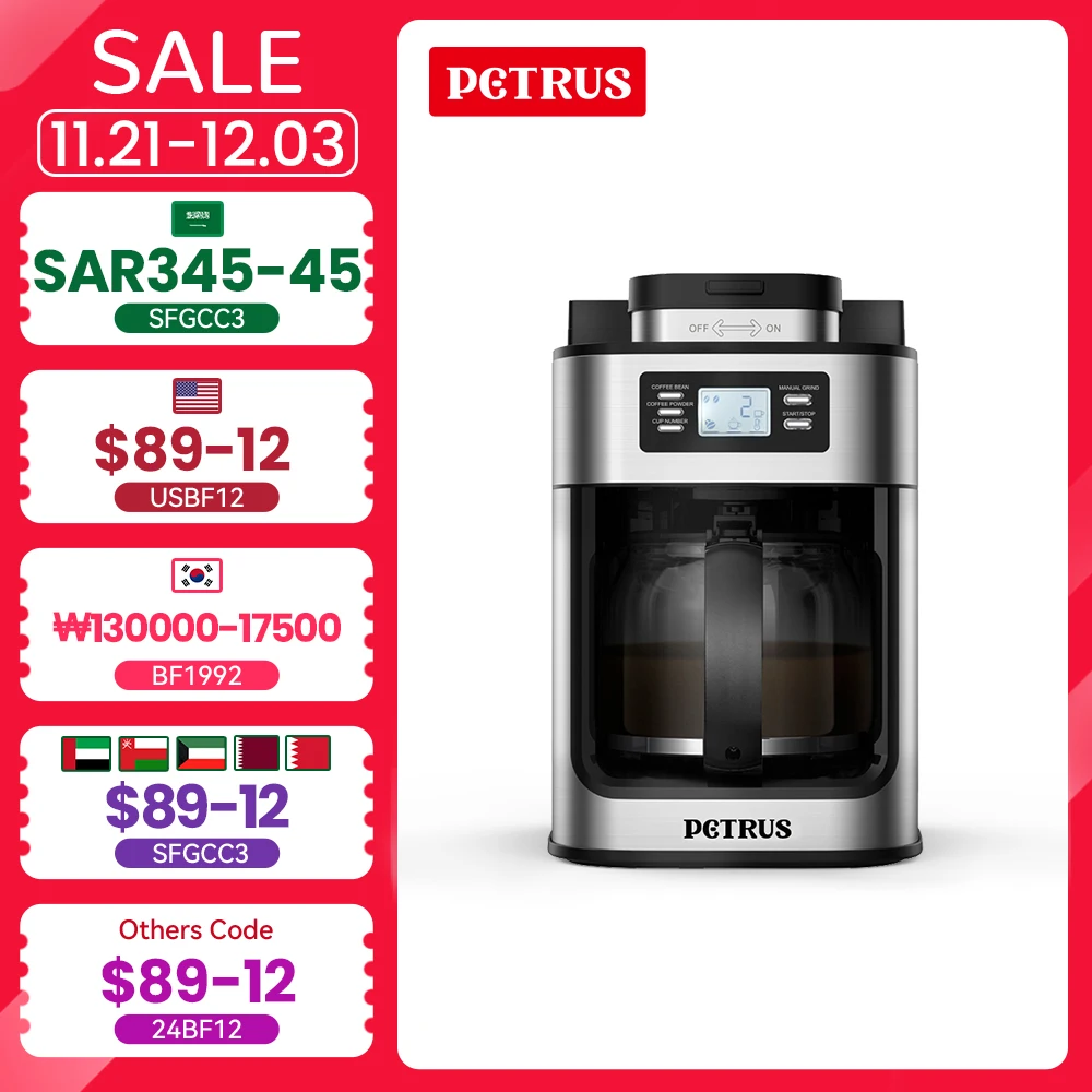 ماكينة صنع القهوة الأوتوماتيكية من Petrus ماكينة صنع القهوة بالتنقيط من الفولاذ المقاوم للصدأ 10 أكواب ماكينة صنع القهوة مع مطحنة مدمجة