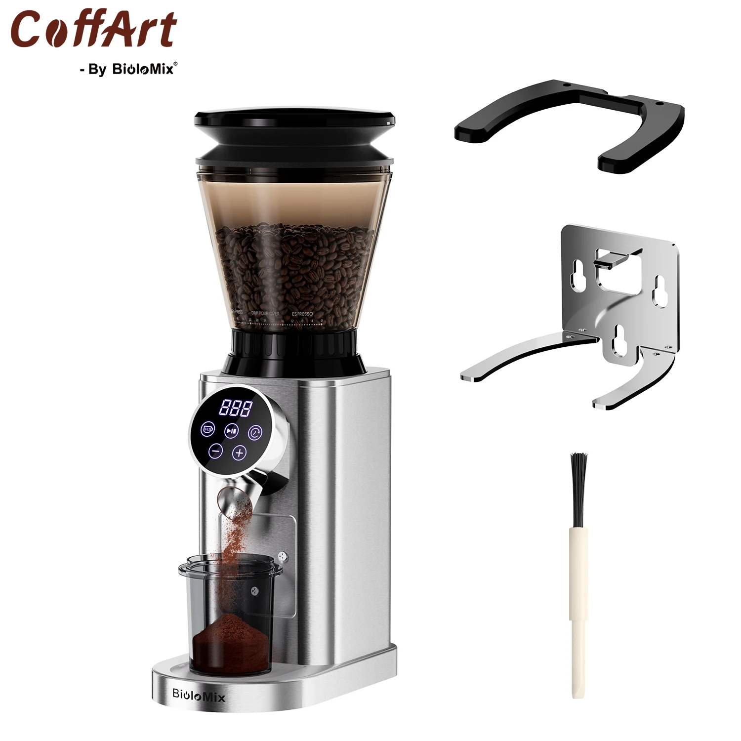 Coffart By BioloMix 48 إعدادات طحن مطحنة القهوة الكهربائية المخروطية القابلة للتعديل، حامل قابل للإزالة