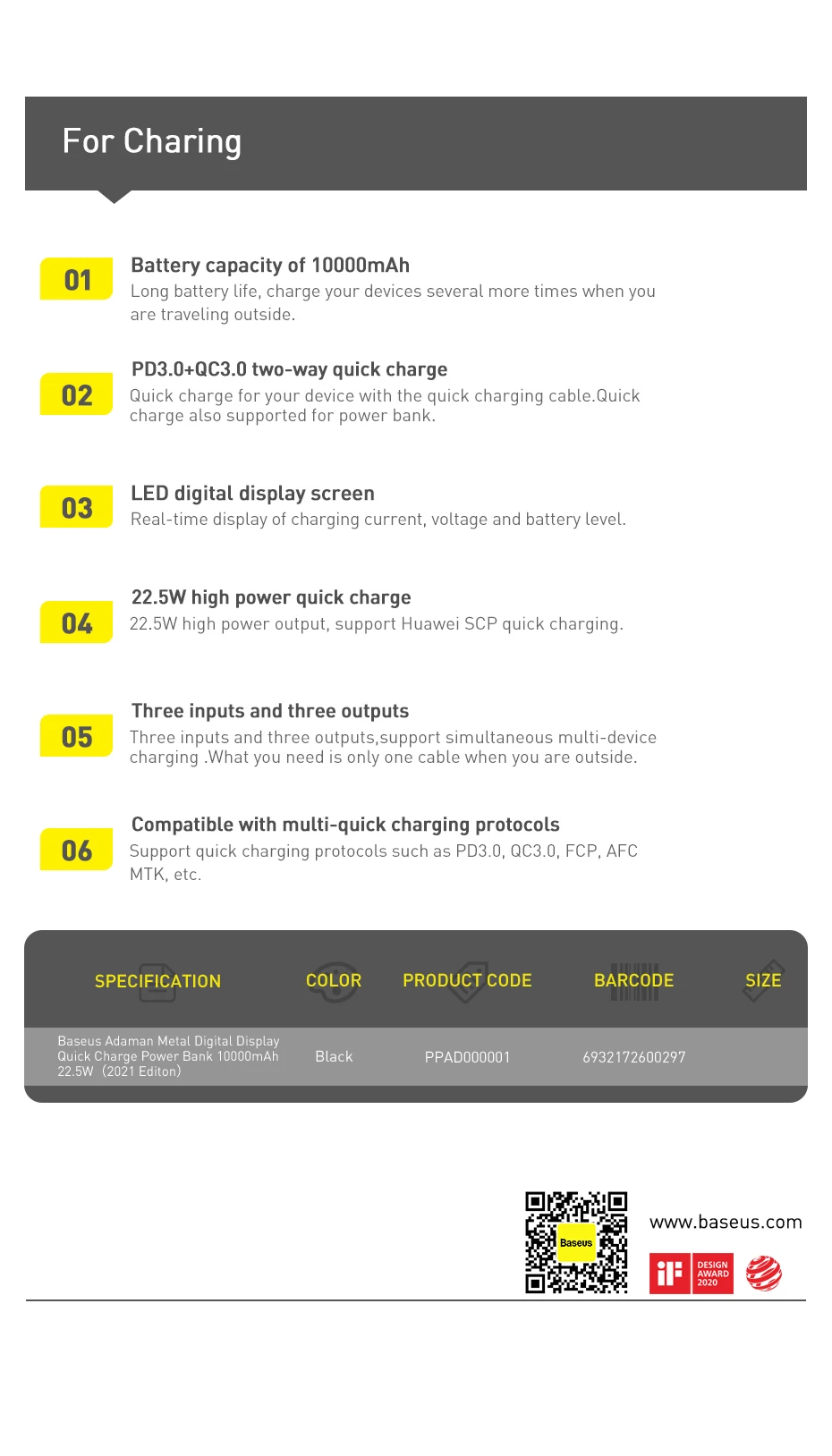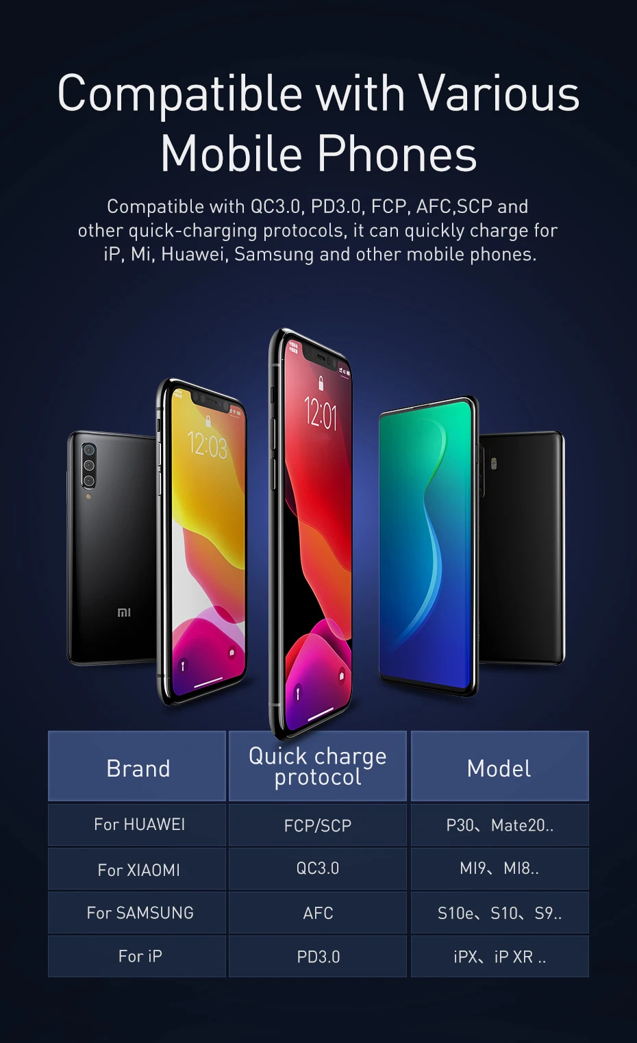 متوافق مع QC3.0 وPD3.0 وFCP وAFC وSCP وبروتوكولات الشحن السريع الأخرى، ويمكنه شحن iP وMi وHuawei وSamsung والهواتف المحمولة الأخرى بسرعة.