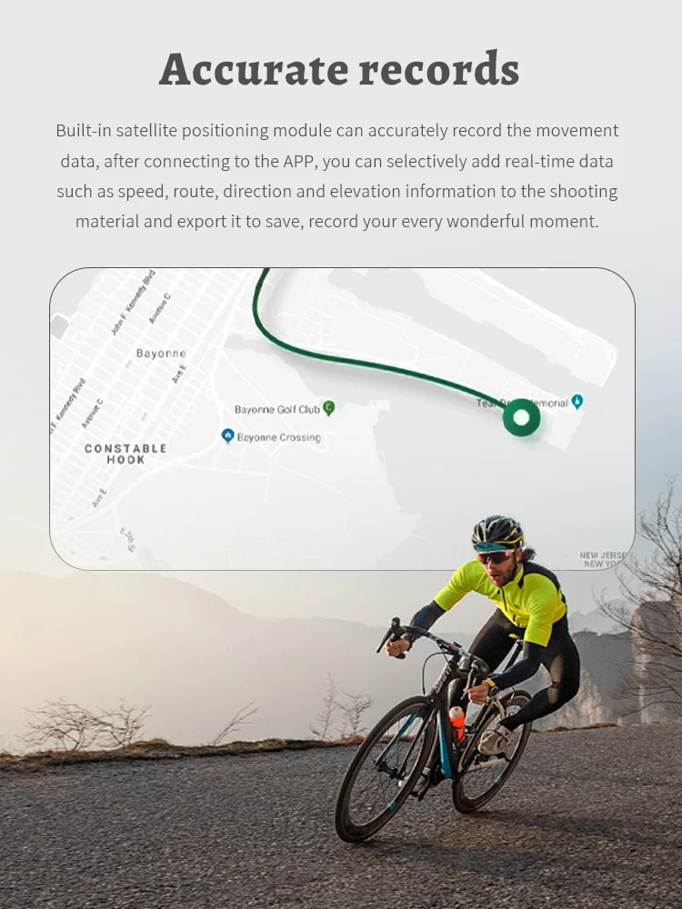 3.تسجيل دقيق.تم تجهيز جهاز التحكم عن بعد الذي يعمل بتقنية Bluetooth بوحدة تحديد المواقع عبر الأقمار الصناعية متعددة الأوضاع، والتي يمكنها تسجيل البيانات الرياضية بدقة.بعد توصيل الكاميرا بالتطبيق، يمكن إضافة البيانات الرياضية في الوقت الفعلي مثل السرعة والمسار والاتجاه والارتفاع بشكل انتقائي إلى مواد التصوير وتصديرها لحفظ وتسجيل كل لحظة مثيرة لديك بدقة.