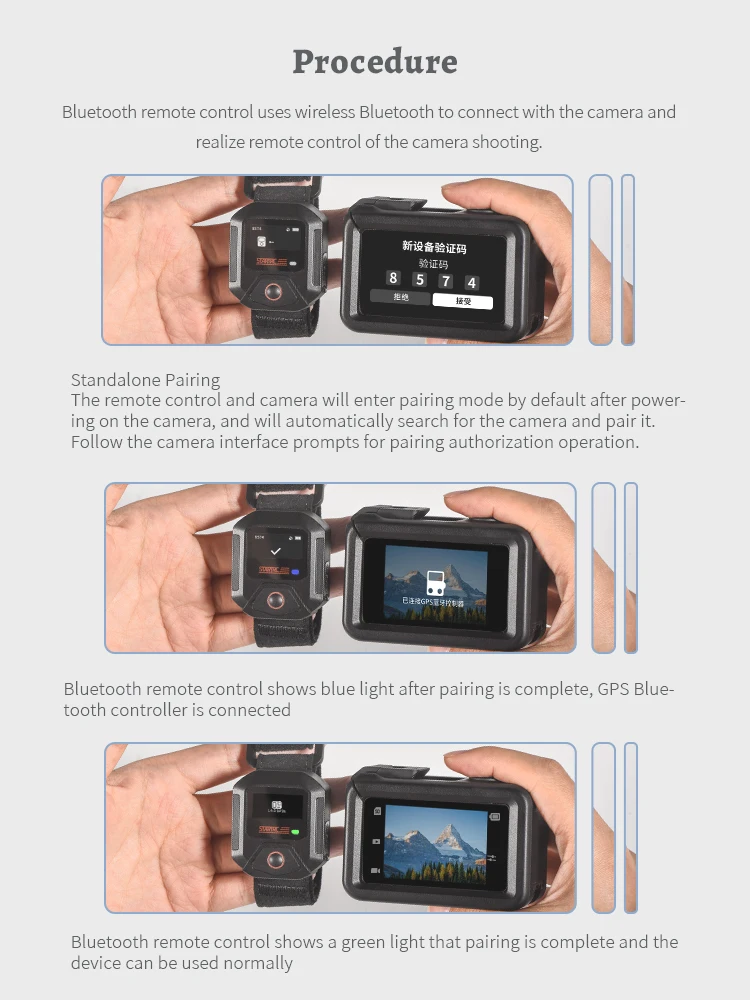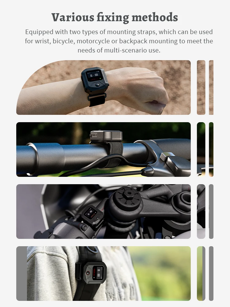 طريقتان ثابتتان.تم تجهيز هذه المجموعة بنوعين من الأشرطة، أحدهما يمكن استخدامه لتثبيت المعصم، ومناسب لبعض الملابس الرياضية قريبة المدى، مع تصميم حزام معصم ممتد، مناسب لمعظم الأشخاص للاستخدام، والآخر يمكن استخدامه للتثبيت على الدراجات والدراجات النارية وحقائب الظهر، ويمكن استخدامها للنقل والتجميع أثناء التشغيل.شريطان مثاليان يمكنهما حل معظم الرياضات الخارجية وتصوير المغامرات.
