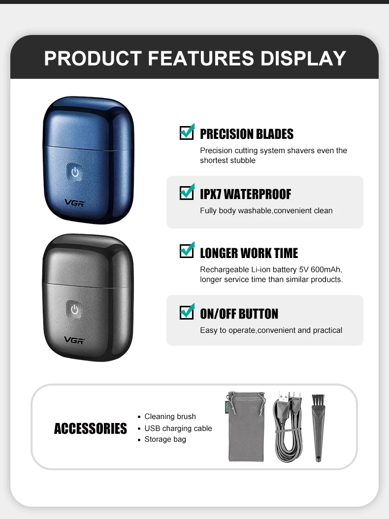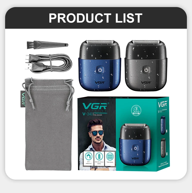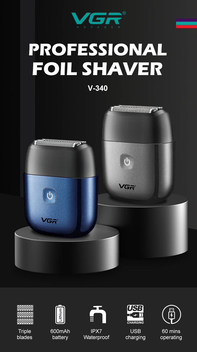 VGR 2024 ماكينة حلاقة كهربائية جديدة ماكينة حلاقة احترافية IPX7 مقاومة للماء قابلة للشحن المحمولة شفرات ثلاثية الحلاقة للرجال V-340