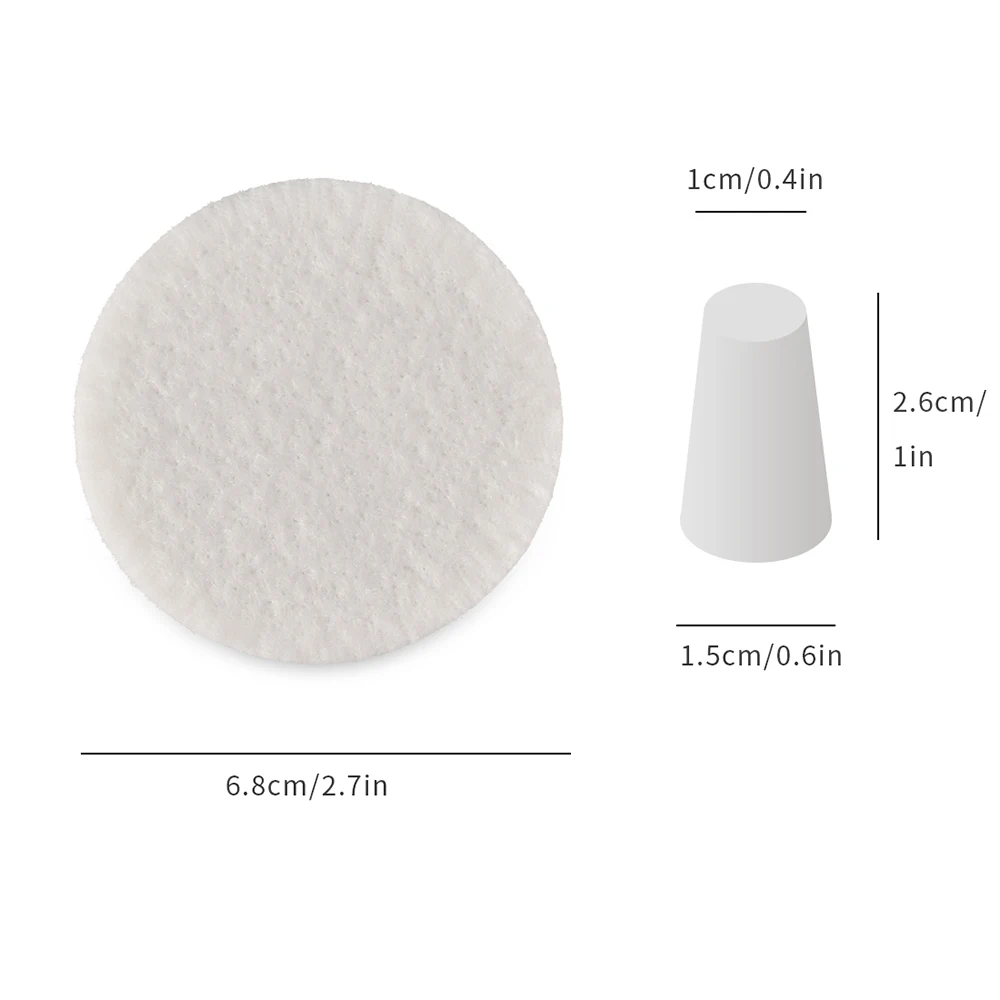 The filters cotton's diameter is 6.8cm/2.7in, the rubber plug  's  top diameter is 1cm/0.4in and the bottom 's diameter is 1.5cm /0.6in